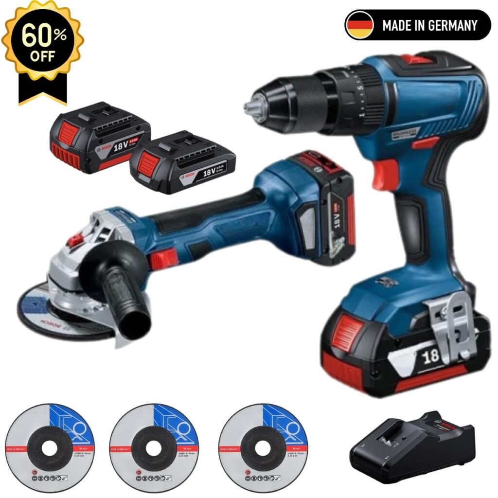 Berbequim de alta potência até 3000 RPM perfura madeira, metal e betão. Rebarbadora de 115mm com motor robusto para cortar, lixar e polir. Duas ferramentas profissionais num só kit - máxima versatilidade para bricolage, construção e renovação - perfura furos até 30mm em madeira e 13mm em aço.